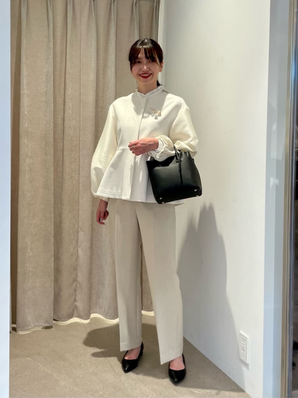 【身長】 165cm 【サイズ感】 ジャケット: ゆったり。165cm、freeサイズ着用。普段Mサイズ着用が多いとブラウス、カットどちらも着れるサイズ感。 トップス: 標準的。165cm、freeサイズ着用でヒップ半分かかるくらいの着丈。やや透け感あり。 ボトムス: ウエスト後ろゴムでややゆとりあり。165cm、38サイズ着用でくるぶしにかかるくらいの着丈。 シューズ: 標準的。普段24.5cm着用、足幅狭め、甲低めだと24cmがジャスト。 【スタイリングポイント】 女性らしいジャケットを主役にホワイトワントーンでまとめたスタイリング。 黒の小物でメリハリをつけ、ブローチで遊びをプラスしました。 入園、入学のセレモニーシーンにもおすすめです!