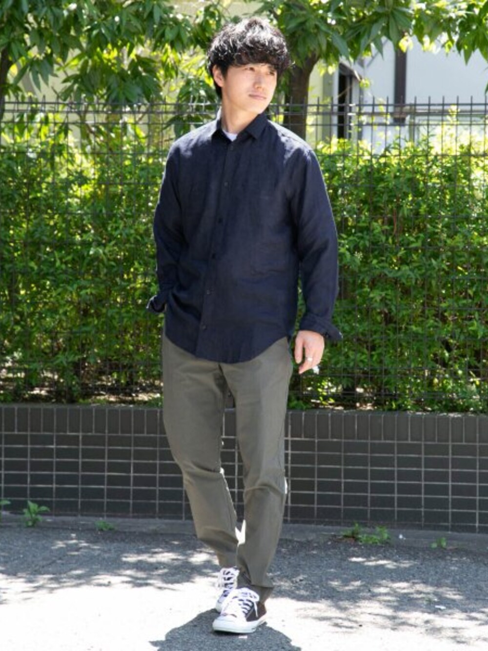 リネン素材のネイビーシャツにカーキのボトムスを合わせた落ち着きのあるカジュアルコーディネート。