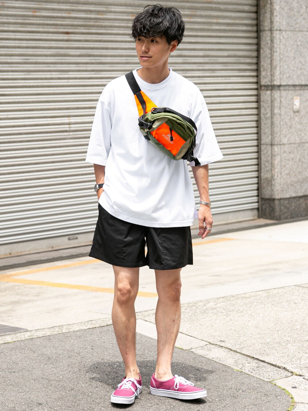 シンプルな夏コーデ! 上下のサイズ感でメリハリを付け今年らしく。 シンプルなアイテムには小物でアクセントを!