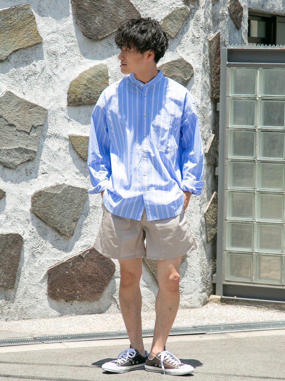 淡いカラーの組み合わせで爽やかにコーディネート。 タイプライターショーツは軽くて涼しくて快適!