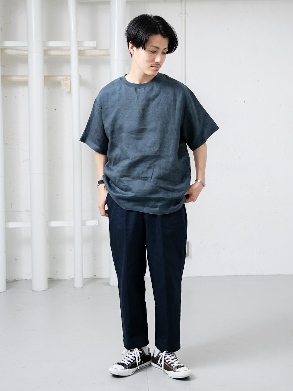 リネン100%の夏場ならではの素材のTシャツで、軽くて着心地抜群です! リネン独特の表情が他にない雰囲気を醸し出してくれます!
