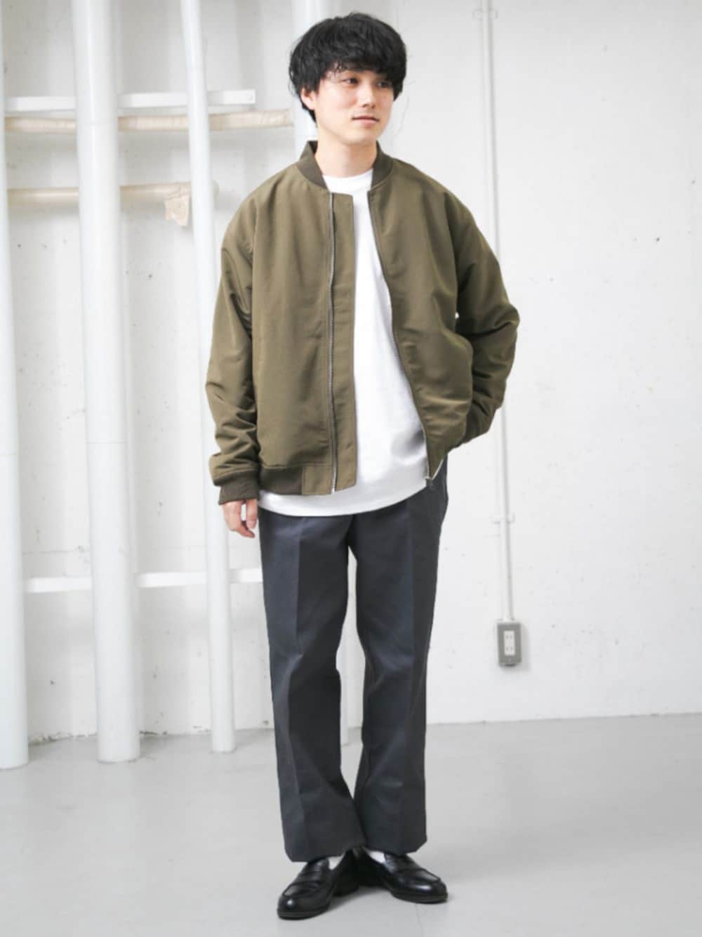 本日は春アウター定番のMA-1ブルゾンでコーディネートです! シンプルにロンTとストレートパンツでコーディネート! ブルゾンはゆったりとしたオーバーサイズシルエットで、軽くて着心地がいいアイテムです。