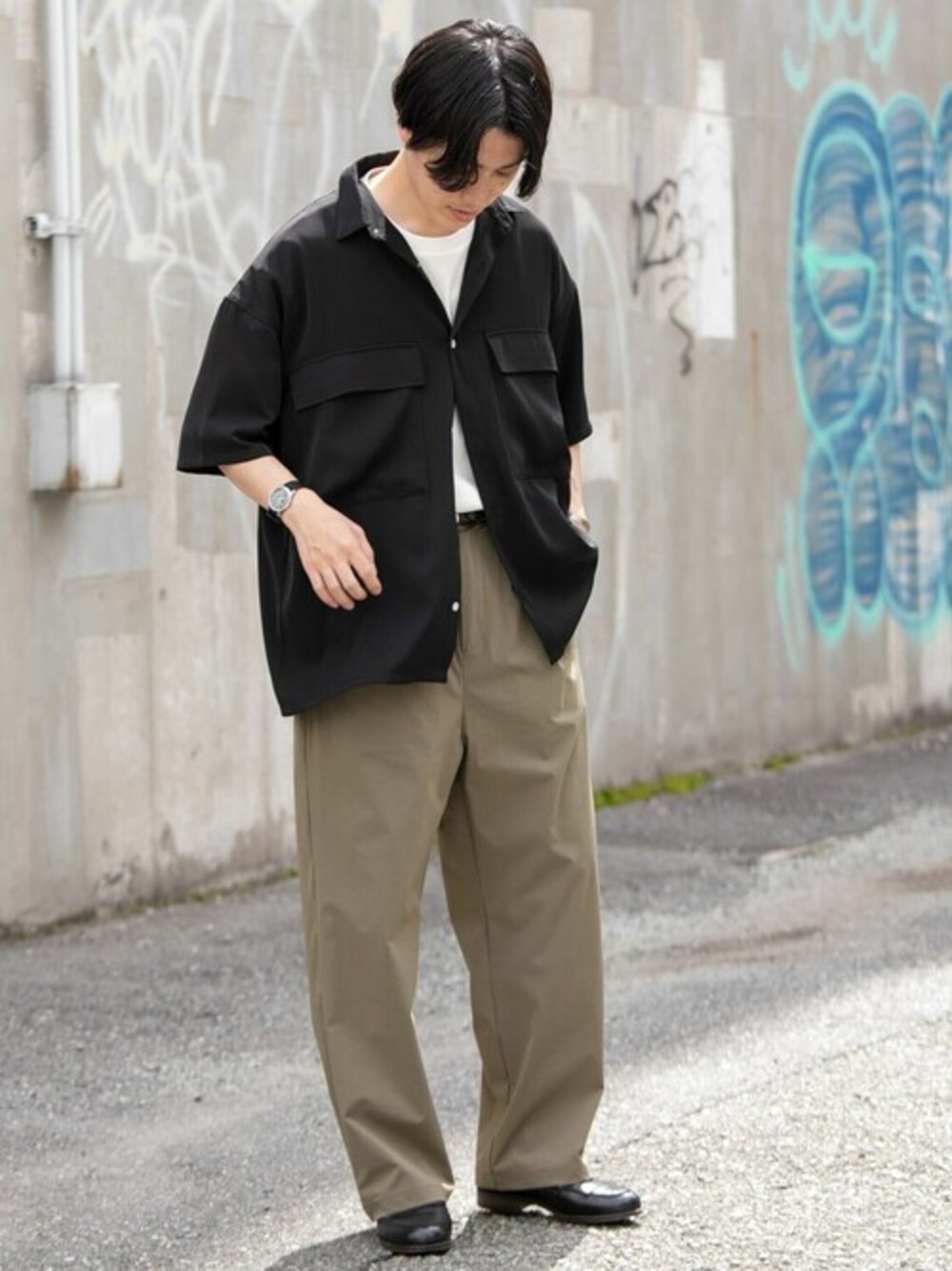 最近では定番になっているCPOシャツでコーディネートです。 シャツはテロっとした素材でワークテイストなデザインながらクリーンに着用いただけます。 シワにもなりにくいのも嬉しいポイントです!