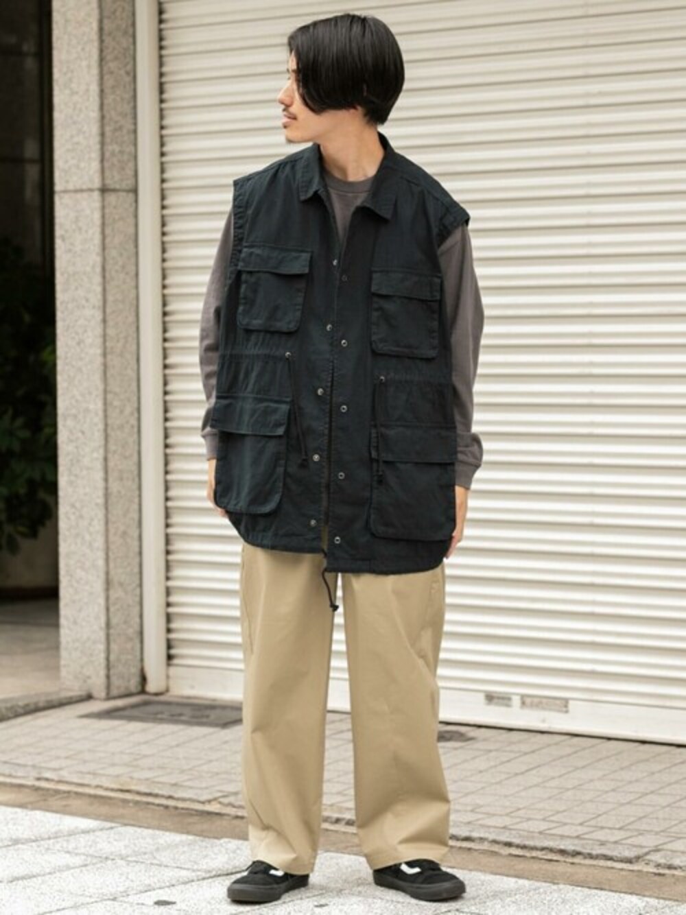 M-65をベースにデザインされた新鮮なミリタリーベストでコーディネートです。 ゆったりとしたシルエットなのでアウター感覚での着用も可能です! ニット、パーカー、スウェットなどをインナーに入れていただくのもおすすめ!
