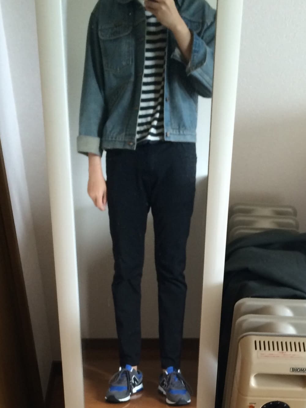 古着のGジャンにマリンボーダーのコーデ。 王道なコーデではあるけれど、足元にニューバランスのスニーカーを持ってきてポイントとして工夫してます。
