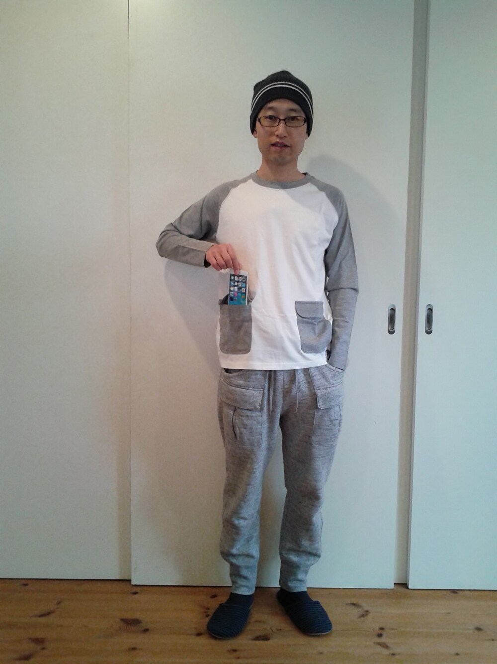 iPhoneが入るポケットTシャツとスウェットとニットキャップのノームコア風ですw