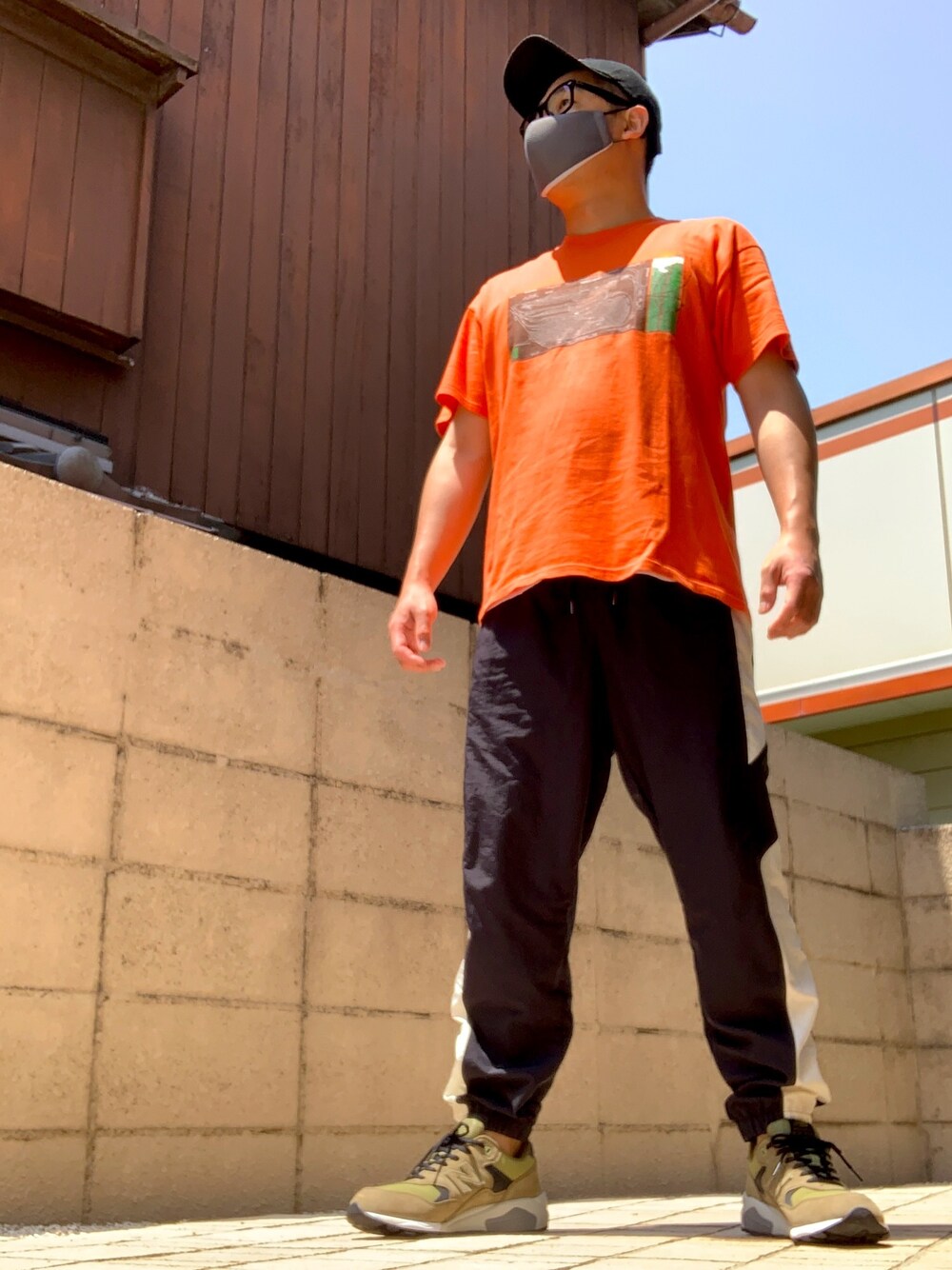 今日も快晴。 あっつー‼︎ トップス:L size 時々着たくなるオレンジ。 ボトムス:M size お得意のアウトレット。@海浜幕張 スニーカ:28.5㎝ 意外とグリーンが“モス”。