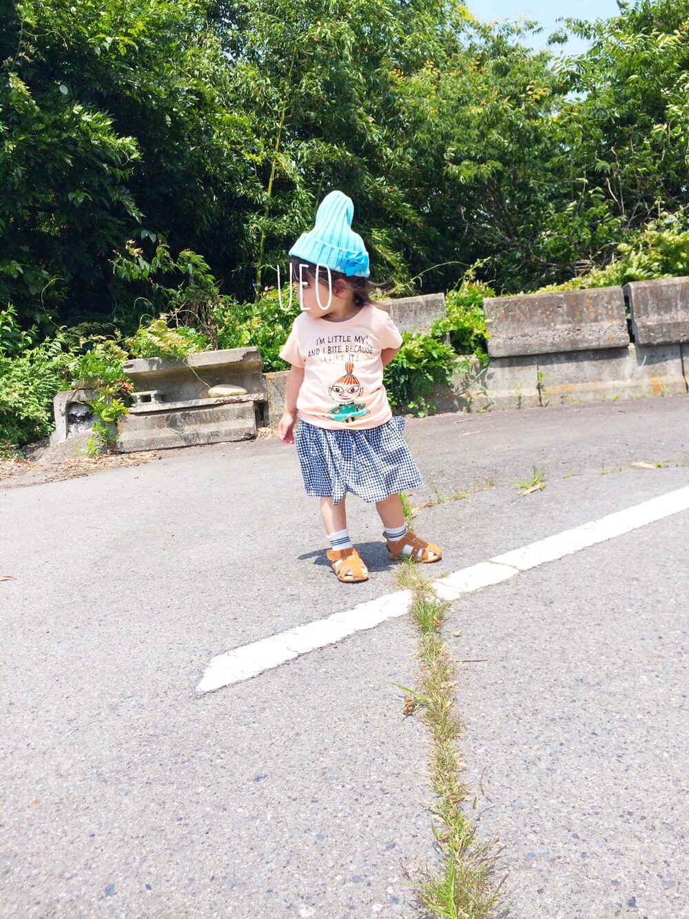 トップス:UT スカート:ハンドメイド 靴下:西松屋 サンダル:西松屋 帽子:GU