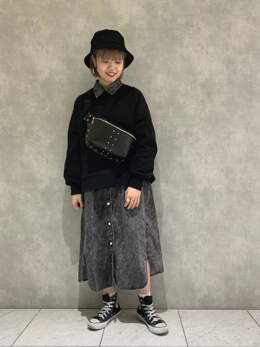 オールブラックコーデ🖤 ワンピースがケミカルブラックなので 重くなりすぎず着ていただけます!! ワンピースはデニムだけど軽いのでとてもオススメです◎ 【Instagram:ue___pageboy】