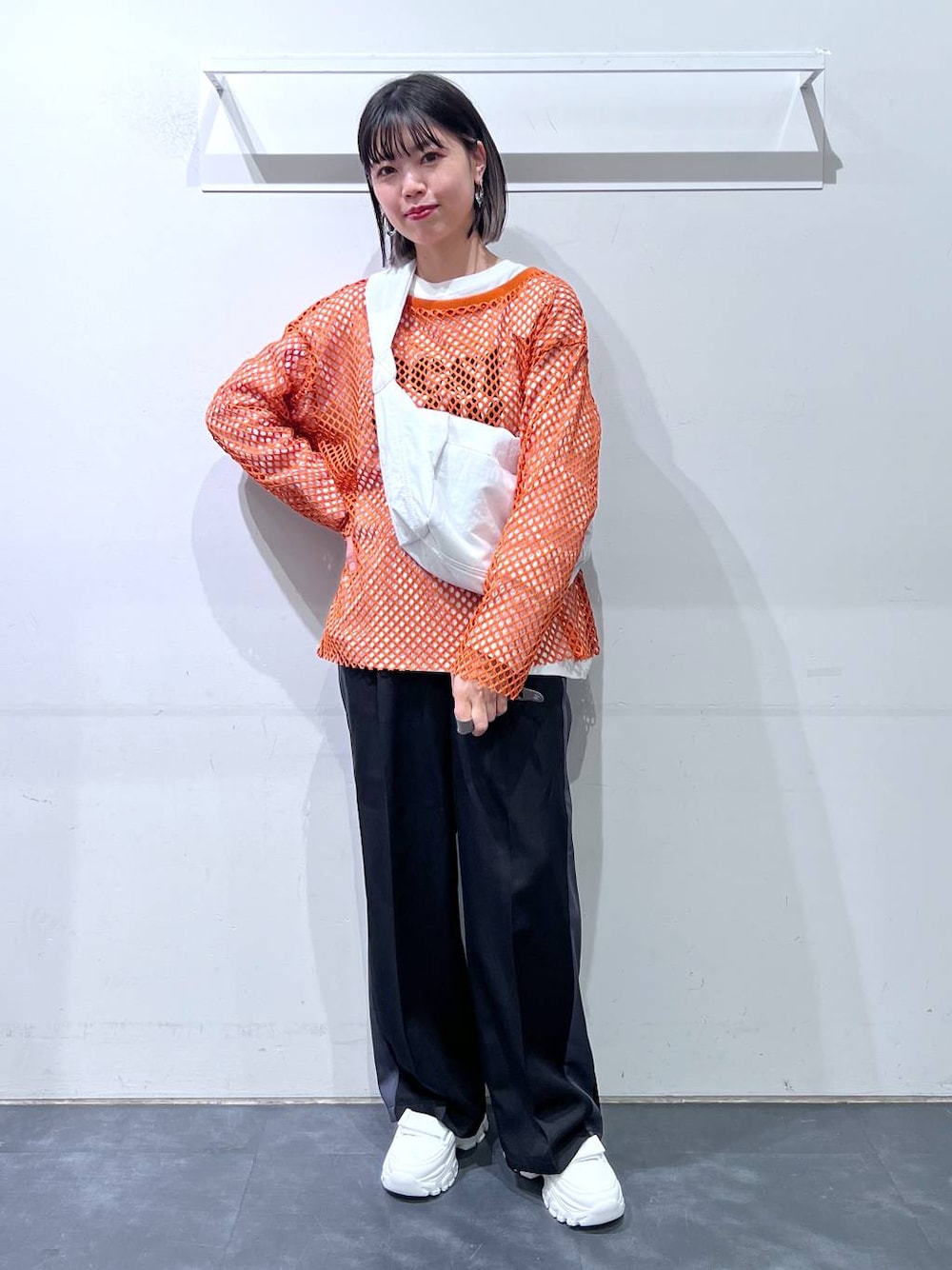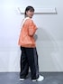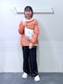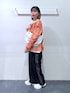 【153cm/骨格ウェーブ】 トップス→メッシュ網がオシャレな1着。オレンジカラーが他にはなくてかわいいです! 夏まで使える素材感なのもポイント! パンツ→丈感ジャスト。センタープレストサイドラインがスッキリ見えが叶います!また、ウエストゴムなのもポイント!!
