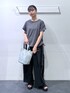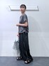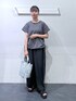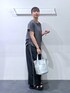 【153cm/骨格ウェーブ】 トップス⇒ビジューのデザインがオシャレ。シャーリングになっているのでスタイルアップ効果が期待できます! パンツ⇒丈感ジャスト。腰周りがゆったりしているので体型カバーにもなります。また、接触冷感の素材なのでこれからの季節着ていただきやすいです。