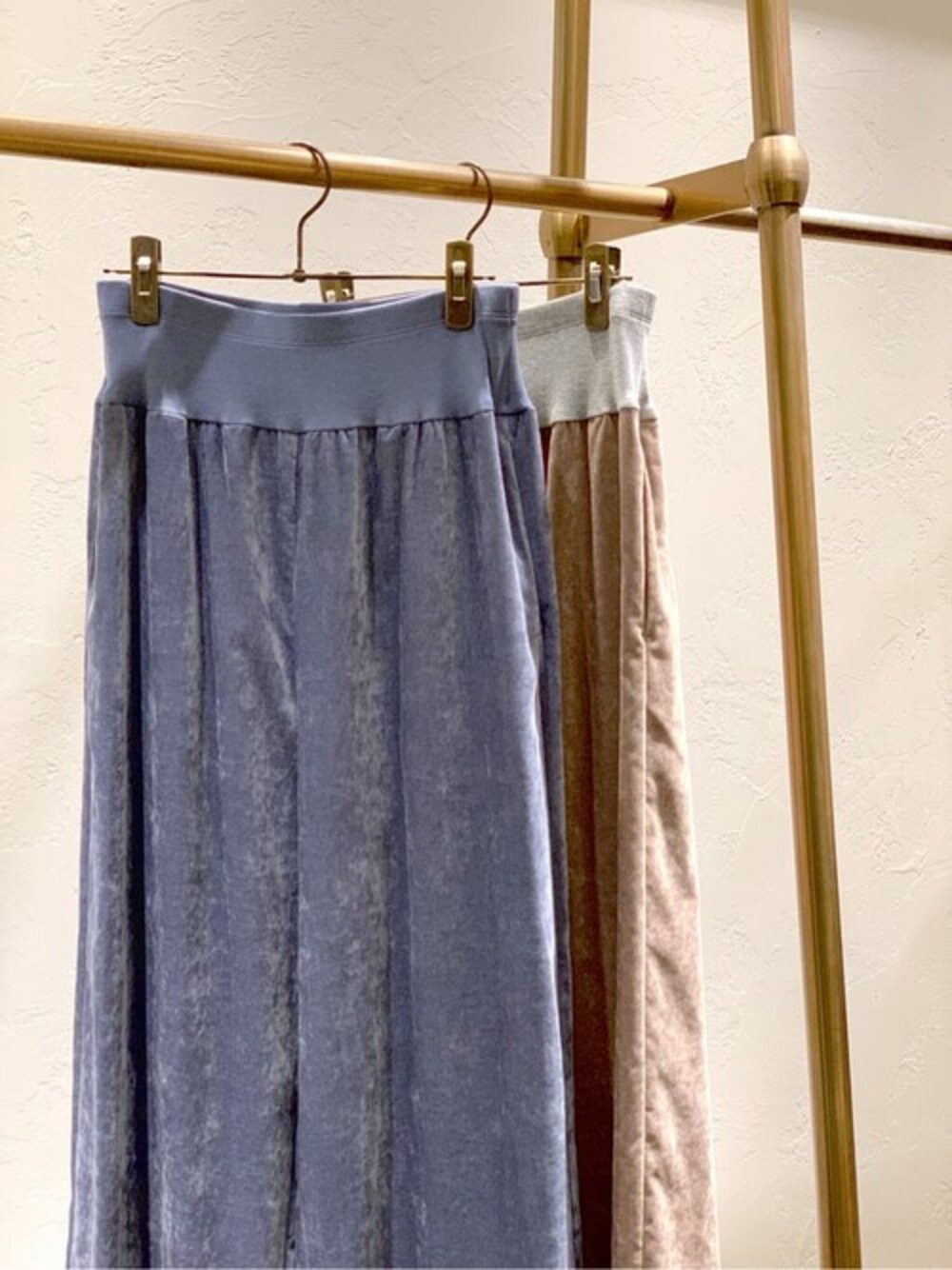【ボトム】Fサイズ ウエストリブベロアパンツ ¥22,000 → ¥11,000(税込) (50%OFF) トレンドのベロア素材が ウエストリブシリーズから登場。 柔らかな素材で落ち感があり、 すっきりしたラインで着ていただけます。