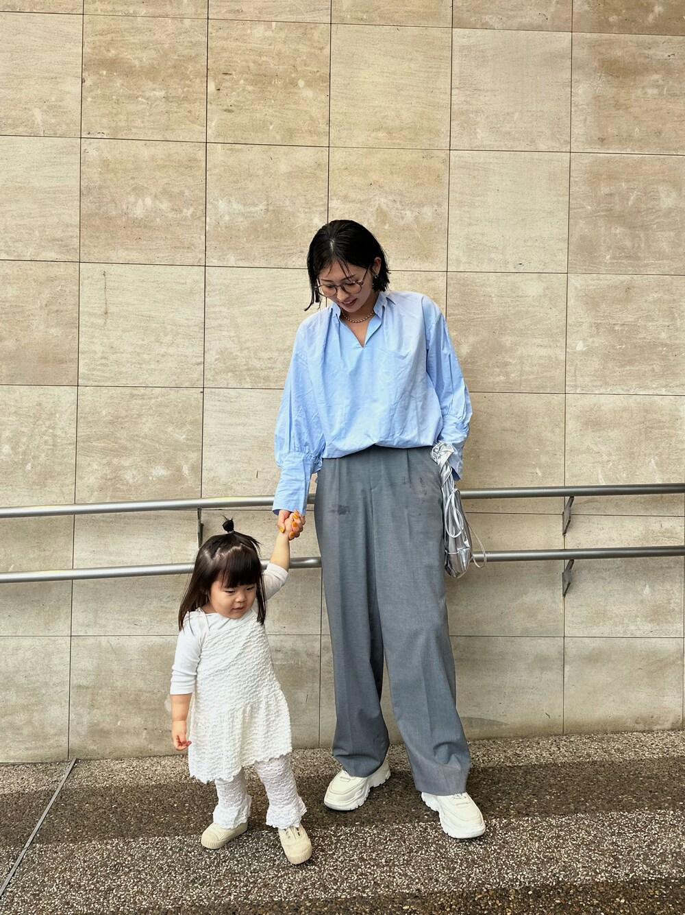 ブルー系のシャツ/ブラウスを着用したレディースの春コーディネートの1枚目の写真