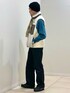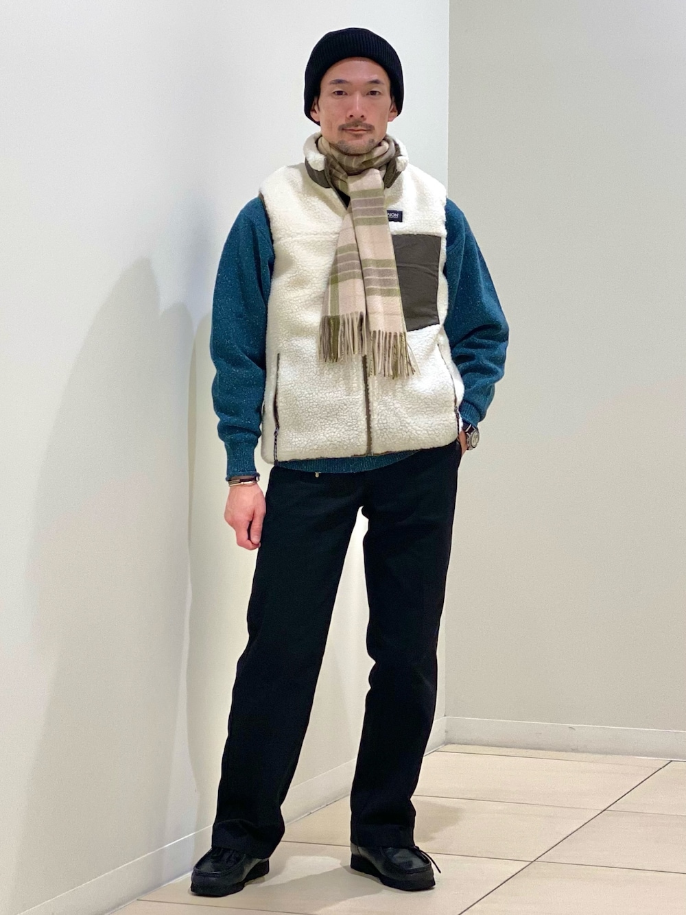 アーバンアウトドアコーディネート。 色合いの違うグリーンのアイテムを合わせて温かみを意識したカジュアルスタイリング。 トップスはTAIONのDOWN×BOA リバーシブルベスト。 スタンドカラーでレトロな雰囲気。 印象が変わるボアとナイロンのリバーシブル仕様。 スッキリとしたサイズ感でありながら程よいリラックス感のあるアイテム。 Mサイズ着用。 インナーはWORK ABOUTのドネガルツィード ロールネックニット。 ウール×ポリエステル×ナイロン混紡の保温性の高い生地を使用。 ネップヤーン素材なので温かみある表情。 首元と袖口は程良いカジュアル感のあるロールデザイン。 シルエットはゆったりしながらもコートの下に合わせても着膨れがない程度のシルエット。 Mサイズ着用。 巻物はNOLLEY'S goodmanオリジナルのカシミヤチェックマフラー30。 世界最高のカシミヤと評価されている内モンゴル・オルドス地方のカシミヤを使用。 ベージュ×グレー×グリーンの配色が首元を優しい色合いで彩ってくれるアイテム。 帽子はNine TailorのCuez Watch 。 メリノウールとファインメリノウールをブレンドしたハイグレード糸を使用。 程良い光沢感と弾力がありソフトな肌触りのアイテム。 身長166cm