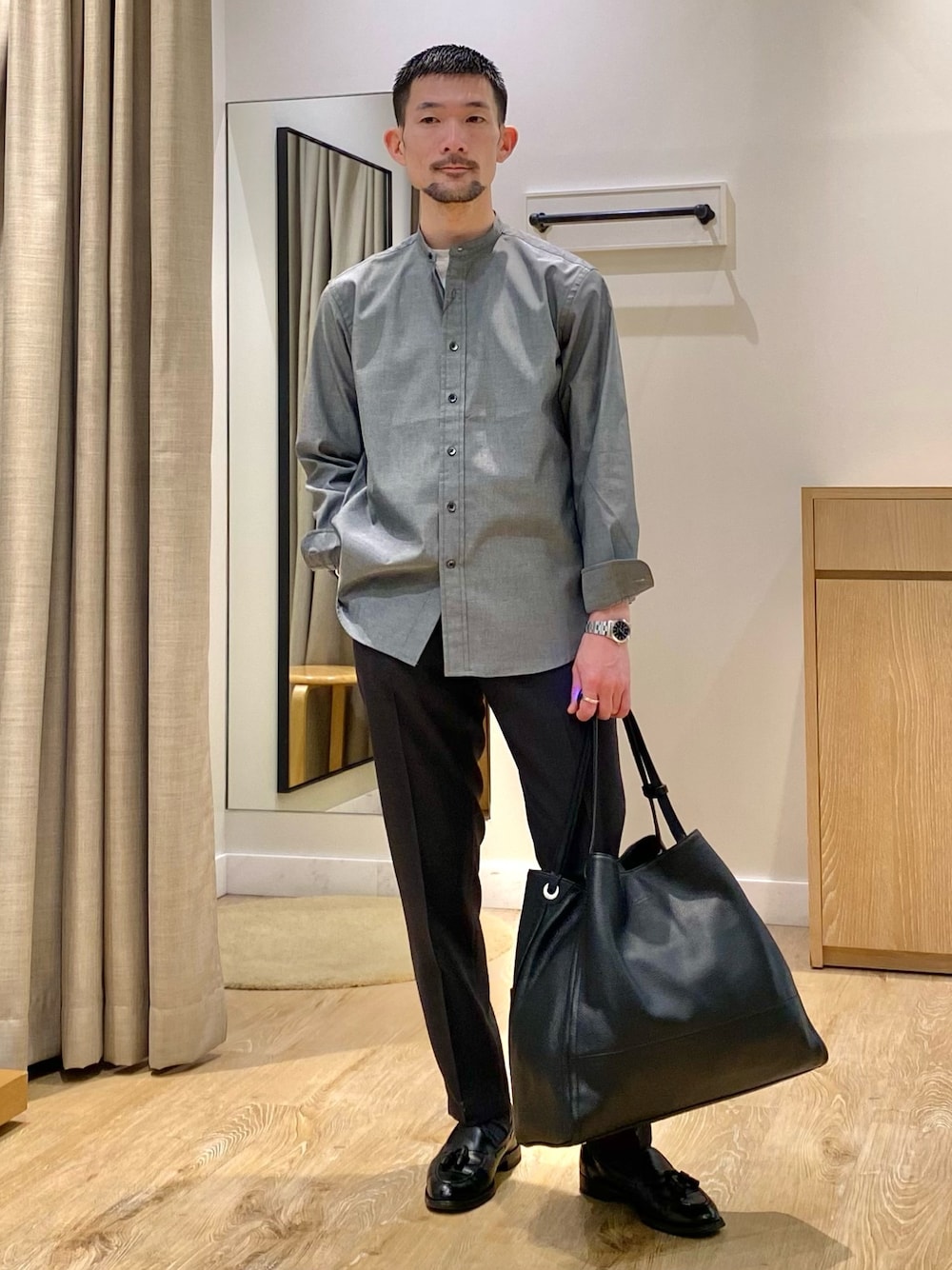 初夏のミニマルなモノトーンシャツコーディネート。 シャツはNOLLEY'S goodmanのストレッチバンドカラーシャツ。 形態安定性があり、ストレッチ性の高いブロード素材を使用。 ミニマルなデザインと、スリムなシルエットでスマートに着こなしにオススメのアイテム。 Sサイズ着用。 パンツはNOLLEY'S goodmanのEVALET リネンライク メッシュイージーパンツ。 吸汗・速乾素材「EVALET」使用。 シワになりにくくストレッチ性も優れている。 適度なゆとりのあるテーパードシルエットでキレイながらもリラックスして着用可能。 Sサイズ着用。 バッグはStutosteinのManhattan イタリアンレザートートバッグ。 全体的にシボ革を使用した上品な質感。 カジュアルだけでなく、ジャケットスタイルにも合わせやすいアイテム。 身長166cm