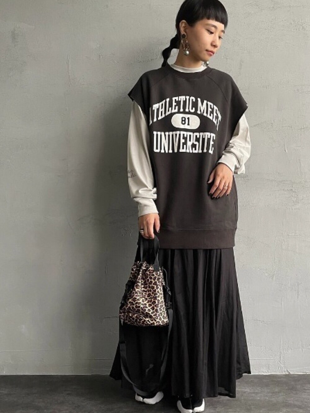 袖プリントが可愛いロンTに、スウェットベストをレイヤード🪡 秋の始まりから早速着られそうです!