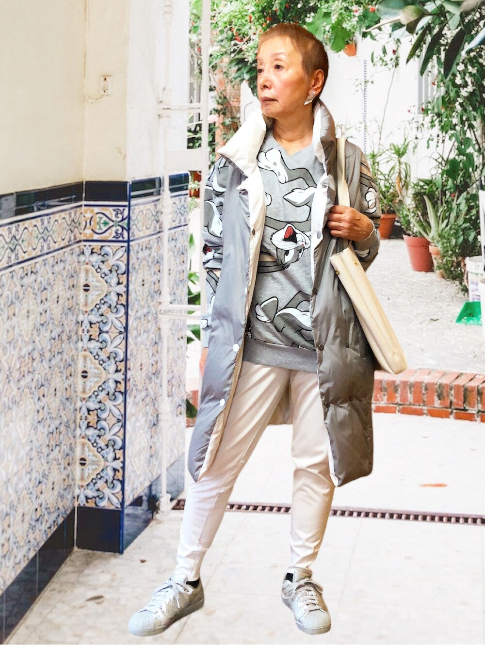 77歳、ロングダウンベストがチョコっとに便利 マッサージにはラフに解放して行きたい #70代ファッション #70代コーデ #ロングダウンベスト #キャラプリント #ワーナーブラザーズ #リバーシブル #リバーシブルベスト #バッグス・バニー #ルーニーテューンズ #ショートカット女子 #スニーカーコーデ #japanesestyle #japanesemadam #japanesemadame #japanesestreetfashion #japanesefashion