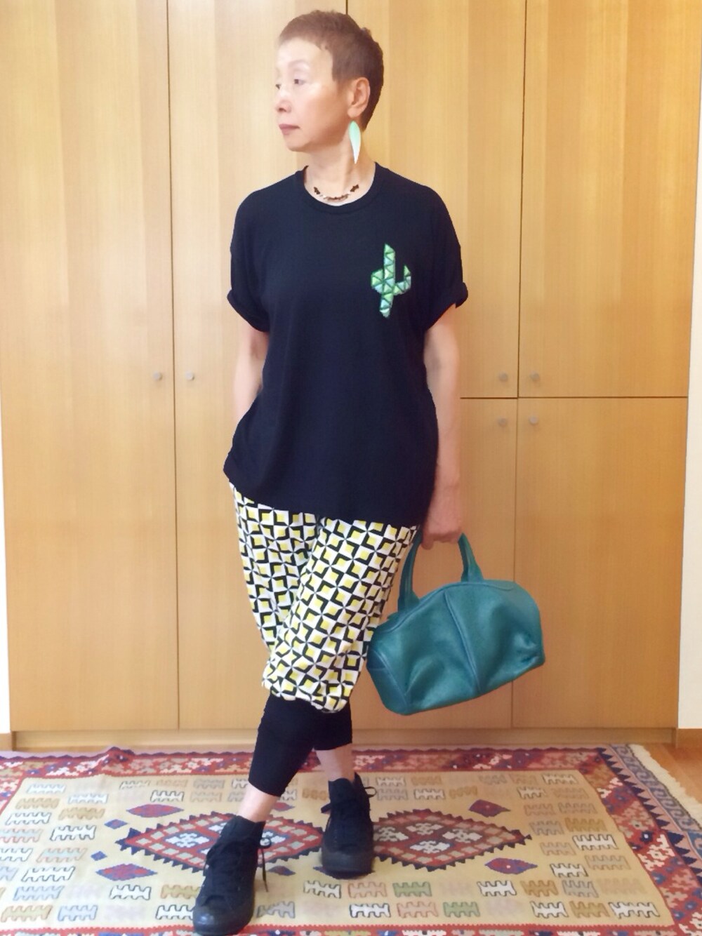 グリーンの綺麗な三角スタッズでサボテン型にデザインされたTシャツとイーリーキシモトの柄がマッチして三角をテーマにネックレスも何気に三角。 腕を貧弱に見せない為にロールアップ。
