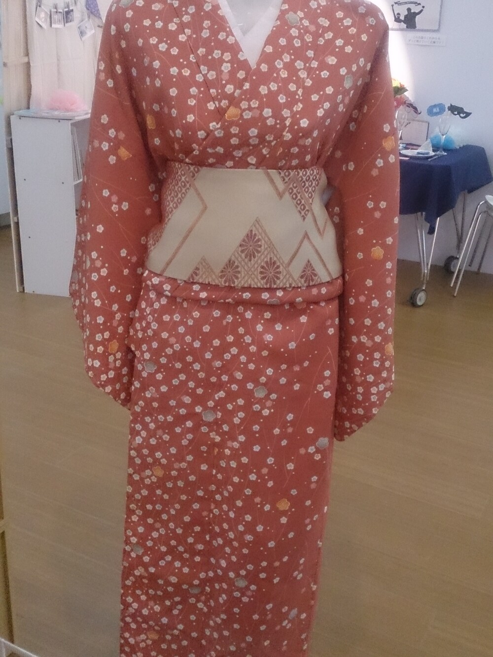 ピンク系の浴衣を着用したレディースの冬コーディネートの1枚目の写真