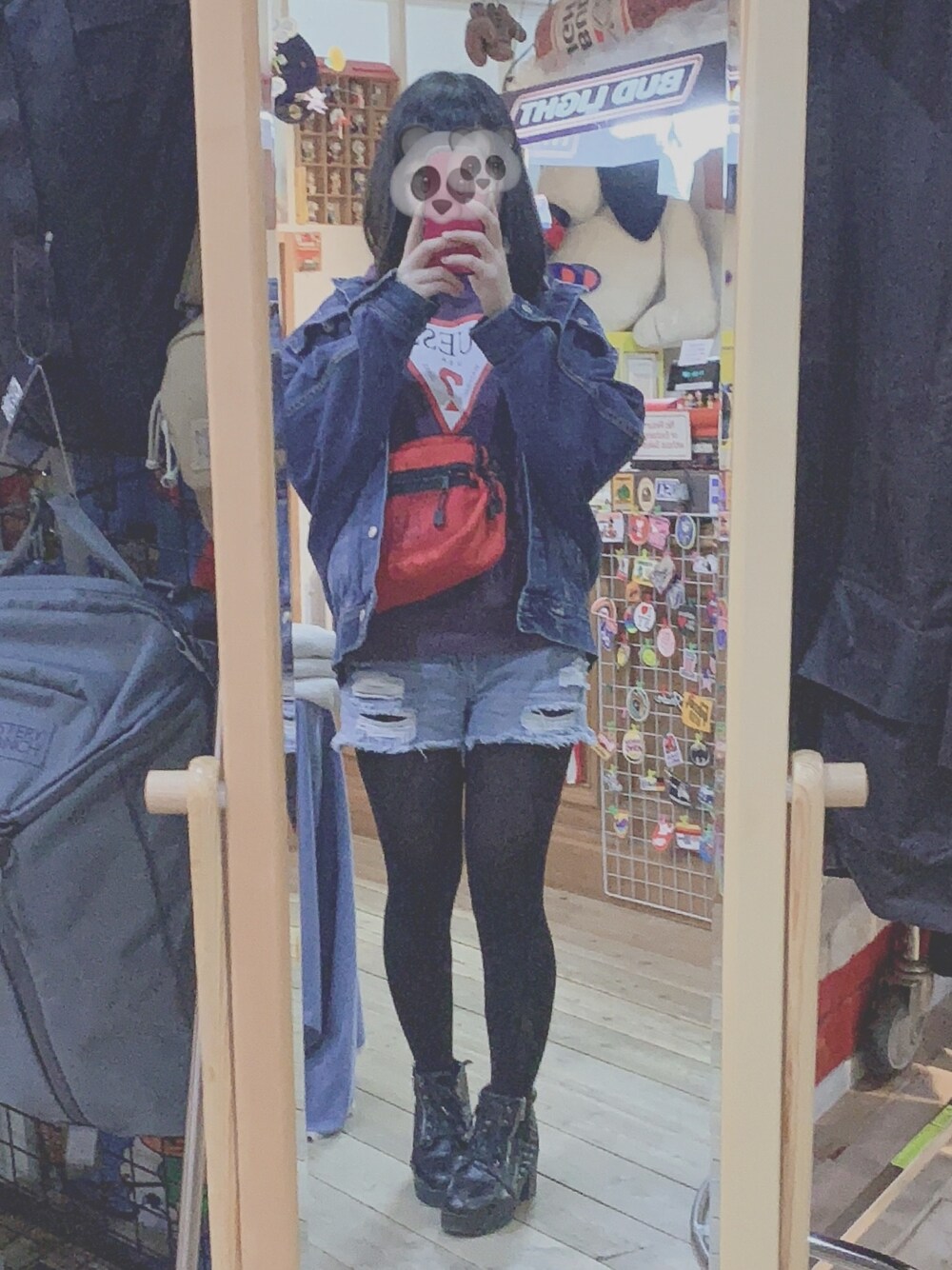 4月から住むアパ-ト探しながら お洋服見に遠出中。 GUESSのパ-カ-お気に入り😁 あえて上のGジャンと下のショ-パンの 色味を変えてみました。 脚の太さ誤魔化せなかった🙃