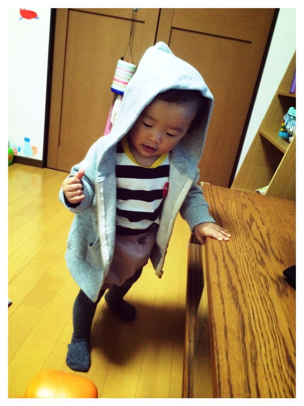 モノトーンコーデに淡いピンクのカボチャパンツあわせてみました(^^) ノーブランドのボーダーロンTに、わたしの着なくなったギャルソンTシャツの刺繍を縫い付けてみました!笑