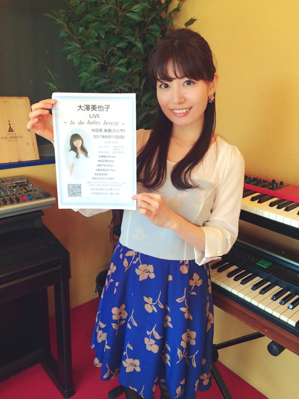 6/11中目黒の「楽屋」にて ソロライブを行います♪ “In the balmy breeze” 6/11(日) 中目黒「楽屋」 http://rakuya.asia/home.shtml 大澤美也子(Vo) 寺田正彦(Key) 伊野アキヲ(G) 丹菊正和(Dr.Per) 木村和夫(B) 第1部 19:30〜 第2部 21:00〜 (入れ替えなし) 予約 ¥3000 当日 ¥3500 予約はTEL 03-3714-2607 または楽屋のサイトにて http://rakuya.asia/home.shtml ご連絡頂けたら、チケット取り置き致します♪