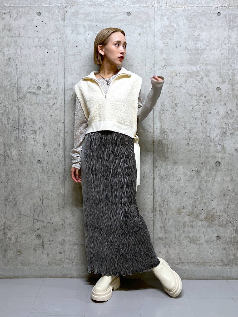 - スカート - なみなみの柄が可愛くベロア素材で暖かみのあるスカート! タイトシルエットでもラインを拾いにくいのが 嬉しいポイント! ウエストも紐で調節できるので安心! - ベスト - フハクのワンピースとのセットアイテム! ※今回はベストのみ使用 トレンドのハーフジップデザインで いろんな着回しができます!
