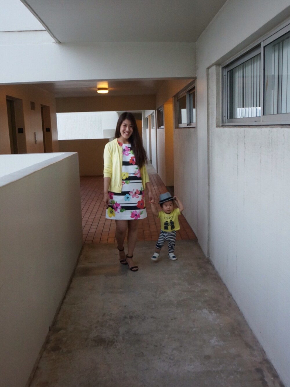 リンクコーデは、イエローとボーダー♡偶然に息子がハットをちょい持ちしてて、キッズモデル 風!笑。