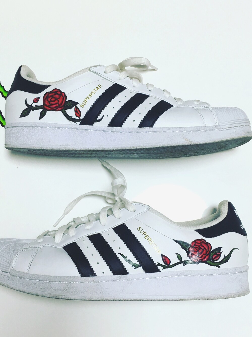 adidasのスーパースターに薔薇を咲かせました! 完全オリジナルの世界に1つです。 自分だけってのが最高にいいし、 自分で描くことで愛着が凄いです。 1つにつき3000円でオリジナルのものを作らせていただいてます。 タンスに眠っているもの 少し飽きちゃったなぁというもの無地で寂しい など今ある服をアップグレードしてまた大好きな1枚にしませんか? お気軽にメッセージお待ちしております。🙌 🎉Instagram🎉 →yu_ji_ro__ 🎉Twitter 🎉 →@0cc3850