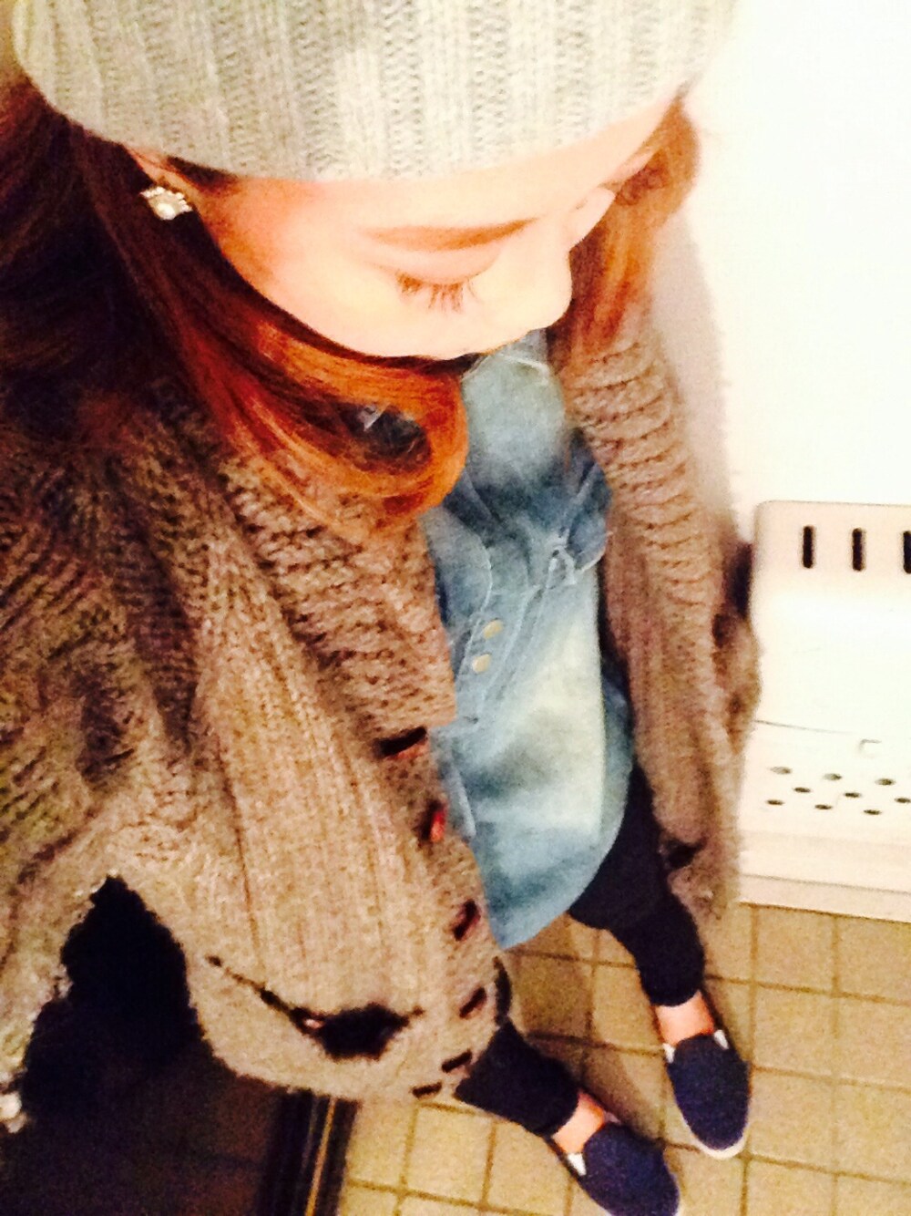 グレー系のカーディガン/ボレロ、ブルー系のシャツ/ブラウスを着用したレディースの秋コーディネートの1枚目の写真