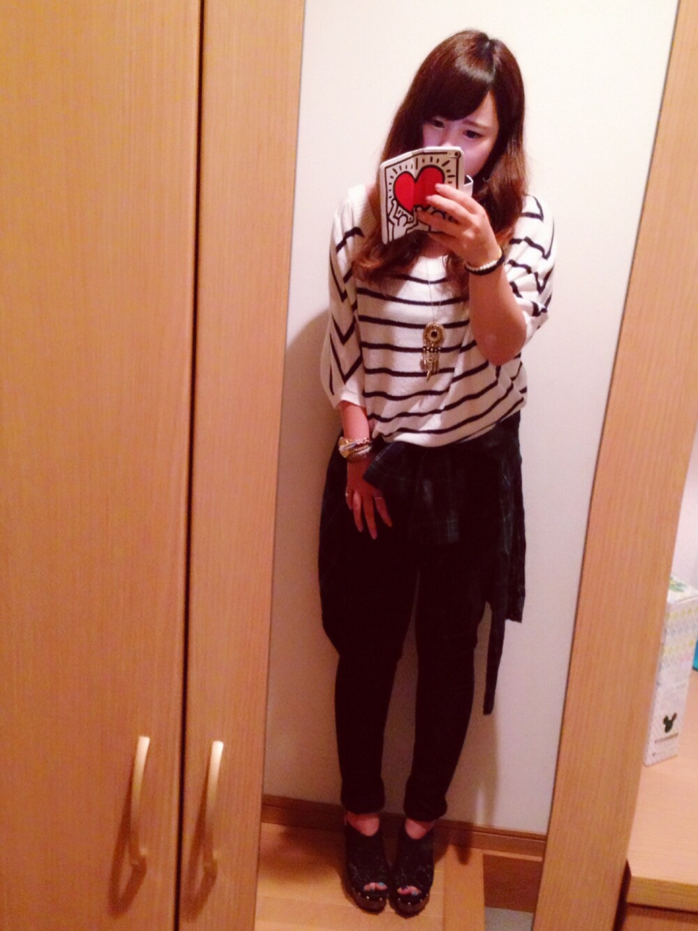 Ukaのニット/セーター「オフショルボーダー5分ドルマンPO」を使ったコーディネート