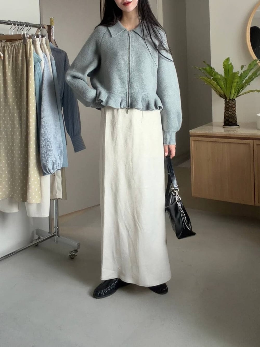 やわらかなブルーのジップニットに ナチュラルなロングスカートを合わせた 上品カジュアルスタイル🩵🐬 ニットはコンパクトな丈感と 裾のさりげないフリルデザインで 羽織るだけでバランスよく決まります。 Iラインシルエットのスカートと合わせることで 甘さを抑えた大人フェミニンな印象に🫧🫧 足元はブラック小物で引き締め デイリーからお出かけまで 幅広く活躍するコーディネートです。