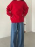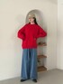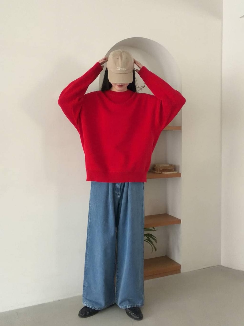 鮮やかな赤色のニットを主役に、ゆるっとしたデニムを合わせて大人カジュアルな着こなしに仕上げました❤️ ゆったりとしたオーバーサイズのシルエットで、リラックス感のあるこなれた雰囲気にしました✨✨ ボトムスには落ち感のあるワイドデニムを合わせて、上下のボリュームバランスが今っぽい印象に。 ベージュのキャップを合わせて、程よくカジュアルダウンさせたのがスタイリングのポイントです🫧