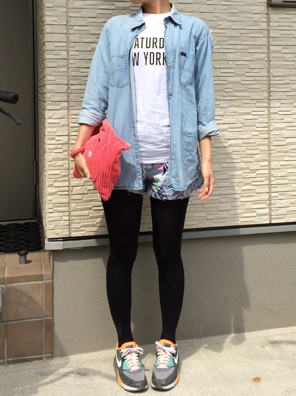 Tシャツ:SATURDAYS SURF NYC パンツ:chershore インポート デニムシャツ:Lee×cher クラッチバッグ:Lee スニーカー:NIKE 子供たちと土手行こー♡