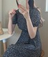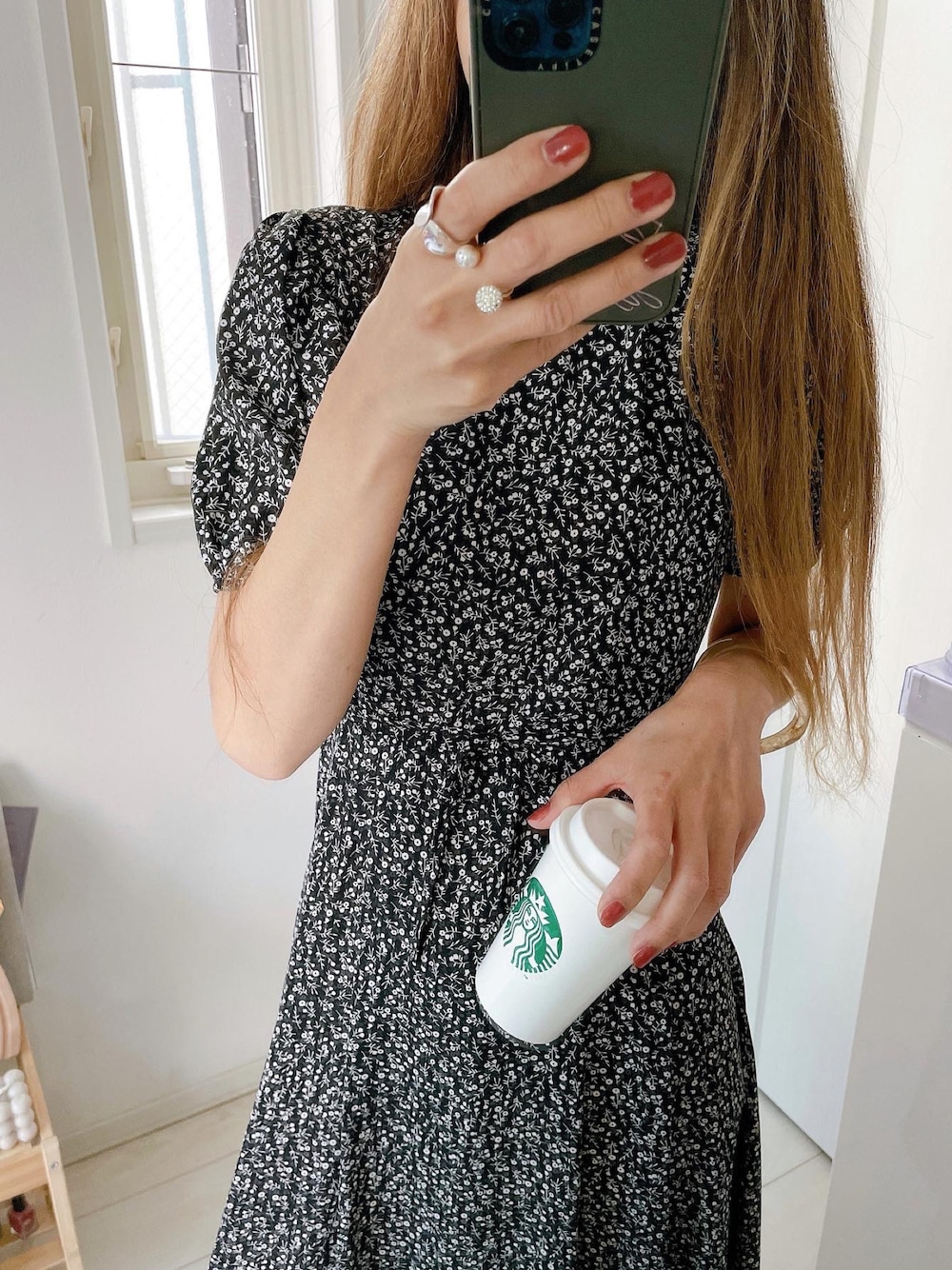 小花柄のレトロ風ワンピース❤︎ 裾にかけてほんのり広がるシルエットが綺麗なんだよ✨ 上品で落ち着いた印象になります❤︎ @lauir_official @junoah_official このワンピース、完売していたけど再入荷してました❤︎