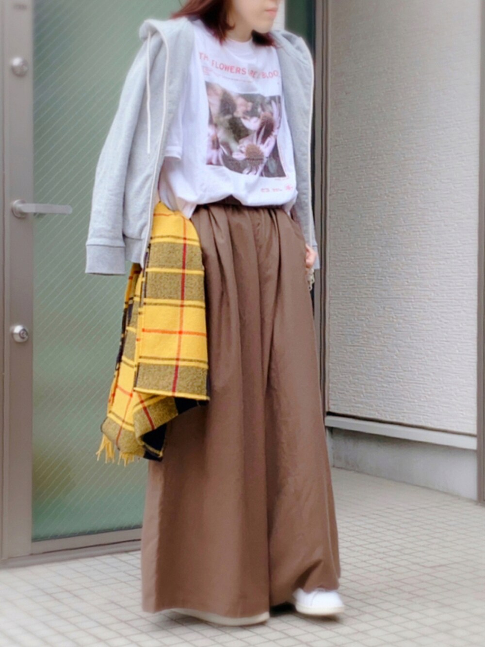 ストール肩から巻いたら、配色が イチョウの木みたいになっちゃったから。 手に持ちました。笑