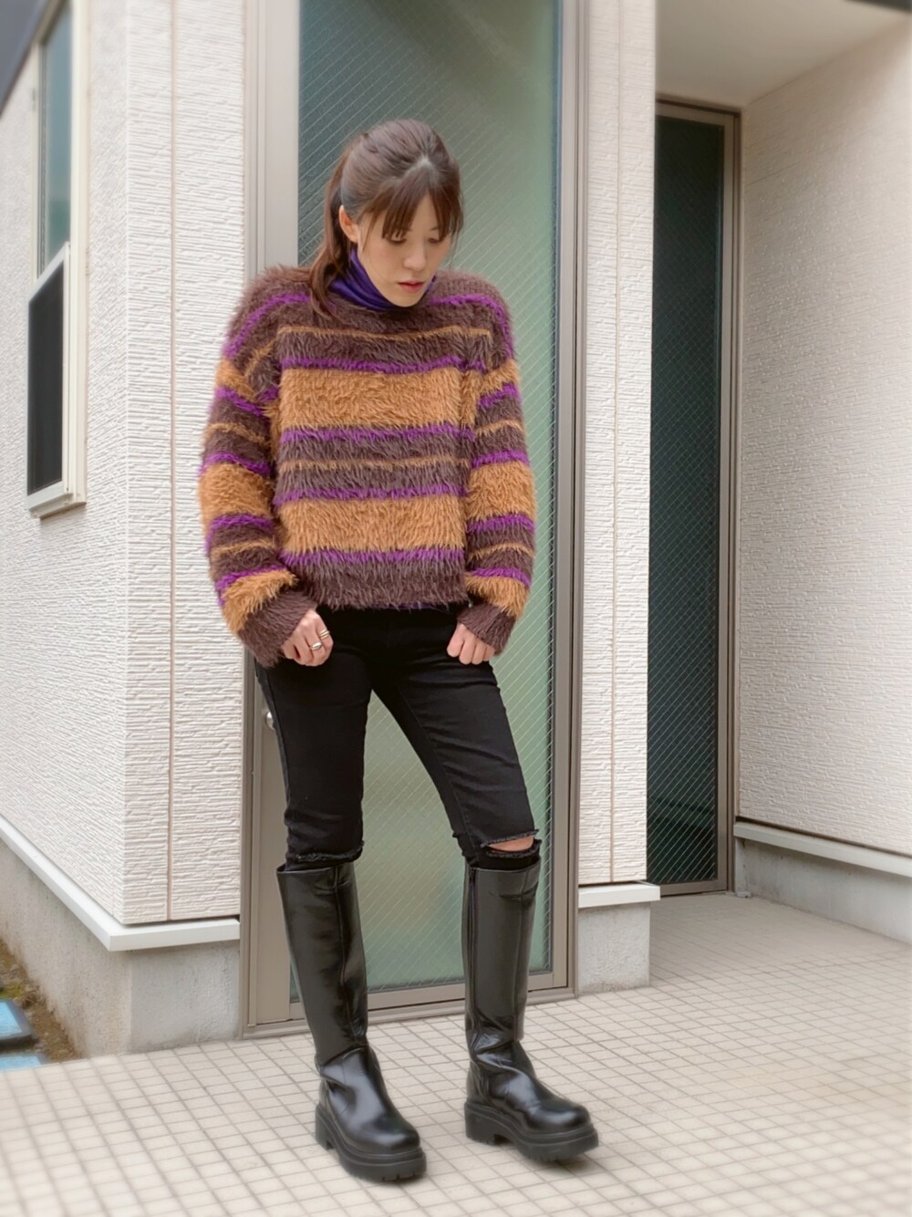 プチプラコーデ! ショート丈のニットに スキニーパンツ! ロングブーツで足元あったか! コート羽織ったバージョンも!