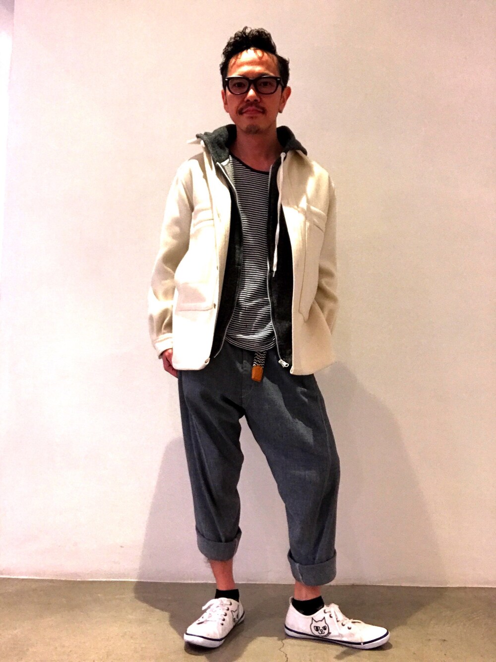 久しぶりの白いスニーカー。少し大きめの白いコート。 最近のお気に入りは、黒縁の伊達メガネ。 本日もバリバリモリモリ元気にいきますよ。