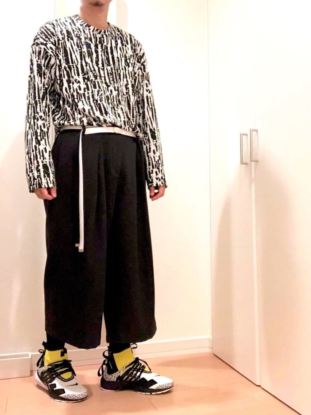 モノトーン柄で合わせてみました。 アート柄のロングスリーブカットソーにNIKE LAB × ACRONYMのフューチャーなデザインのAIR PRESTO MIDでコーデ。