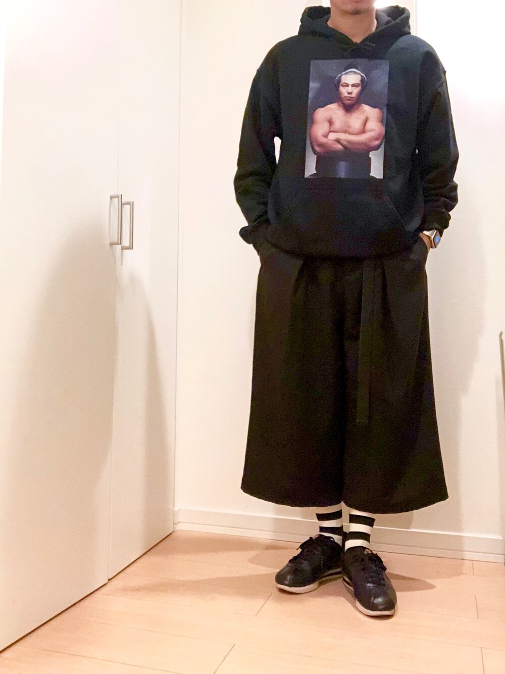 ウルフパーカー!! Tシャツに続いてパーカーも千代の富士w パーカー推しのブラックコーデでも ソックスでアクセント。
