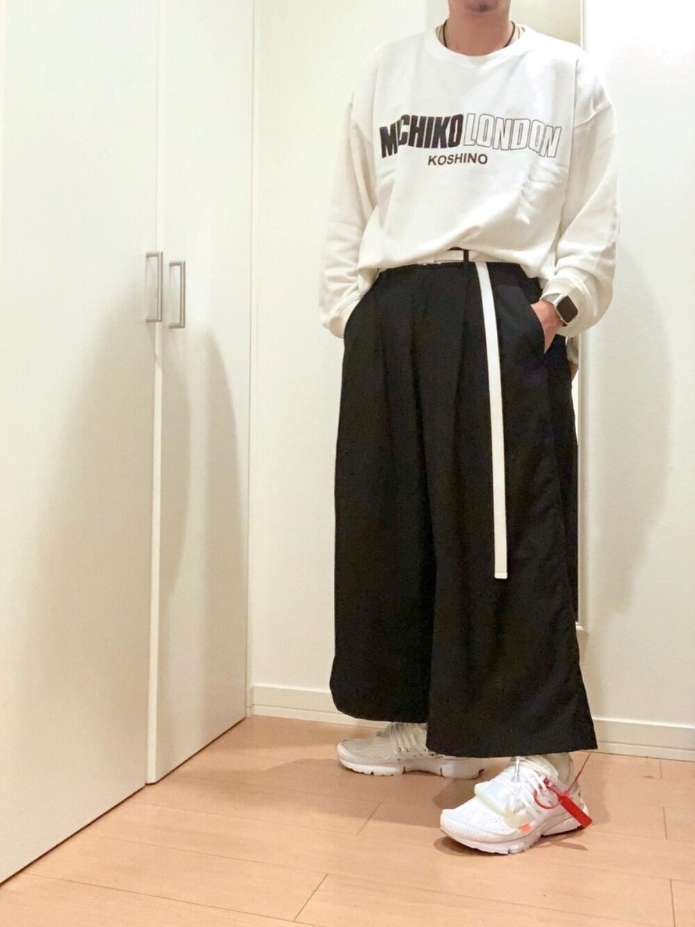 「半分、白い」モノトーンコーデ! メインはロゴも半分白い MICHIKO LONDONのスウェット!