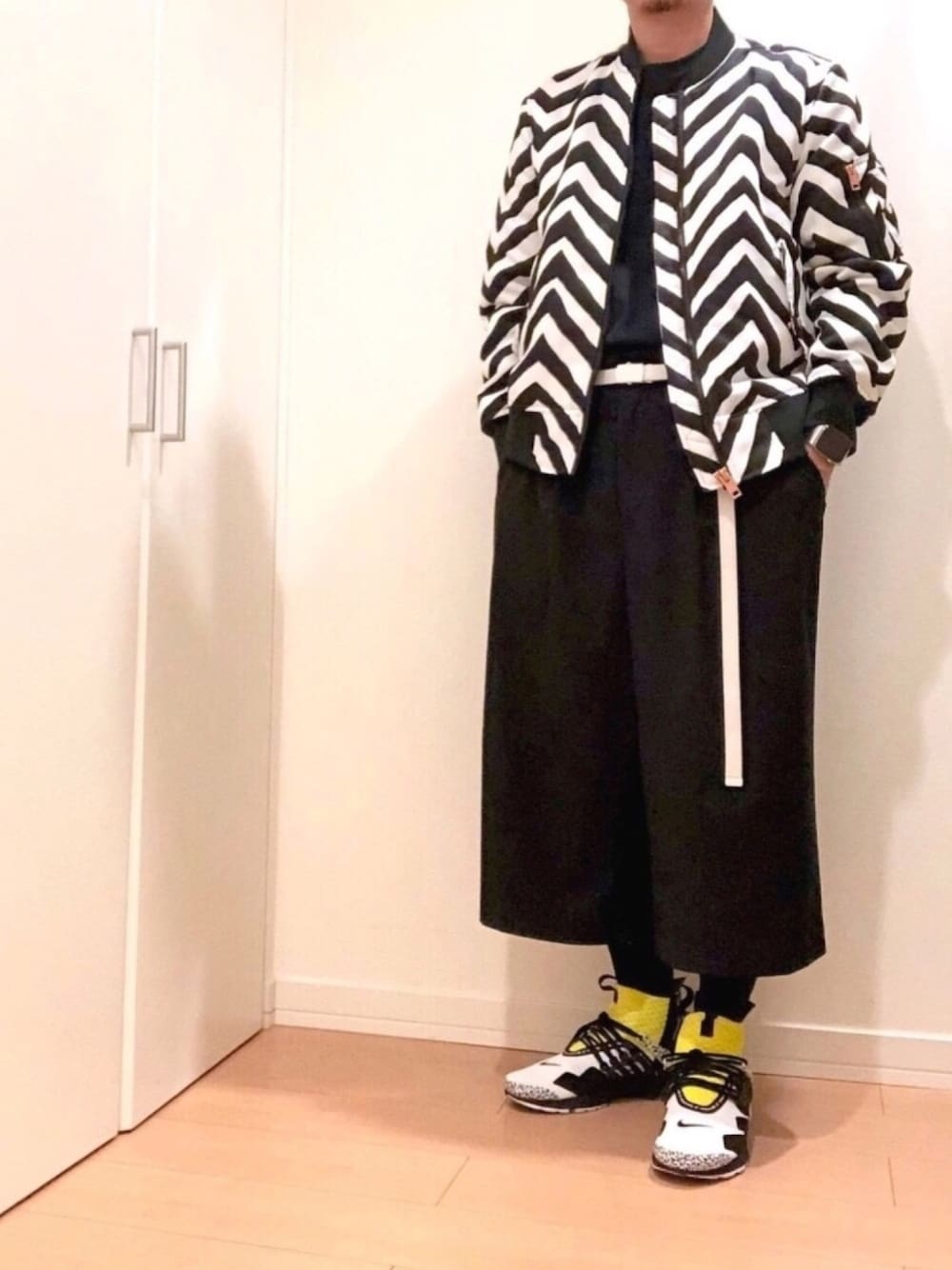 またまたモノトーン柄コーデ ボーダー柄?ゼブラ柄?ジグザグ柄? 白黒ブルゾンに白黒のスニーカー! 昨年アウトレットで見つけた DIESLEのブルゾンは レディースのSサイズだけど 全然着れちゃう!