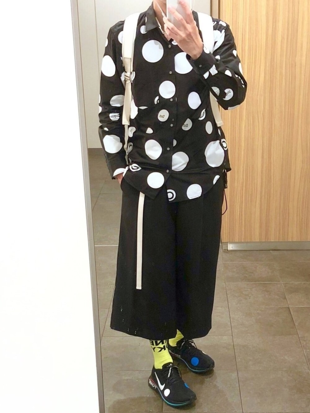 ドットでブラックコーデ! ドット柄シャツにドット風スニーカー ソックスをネオンカラーのイエローでアクセントにしてみました。