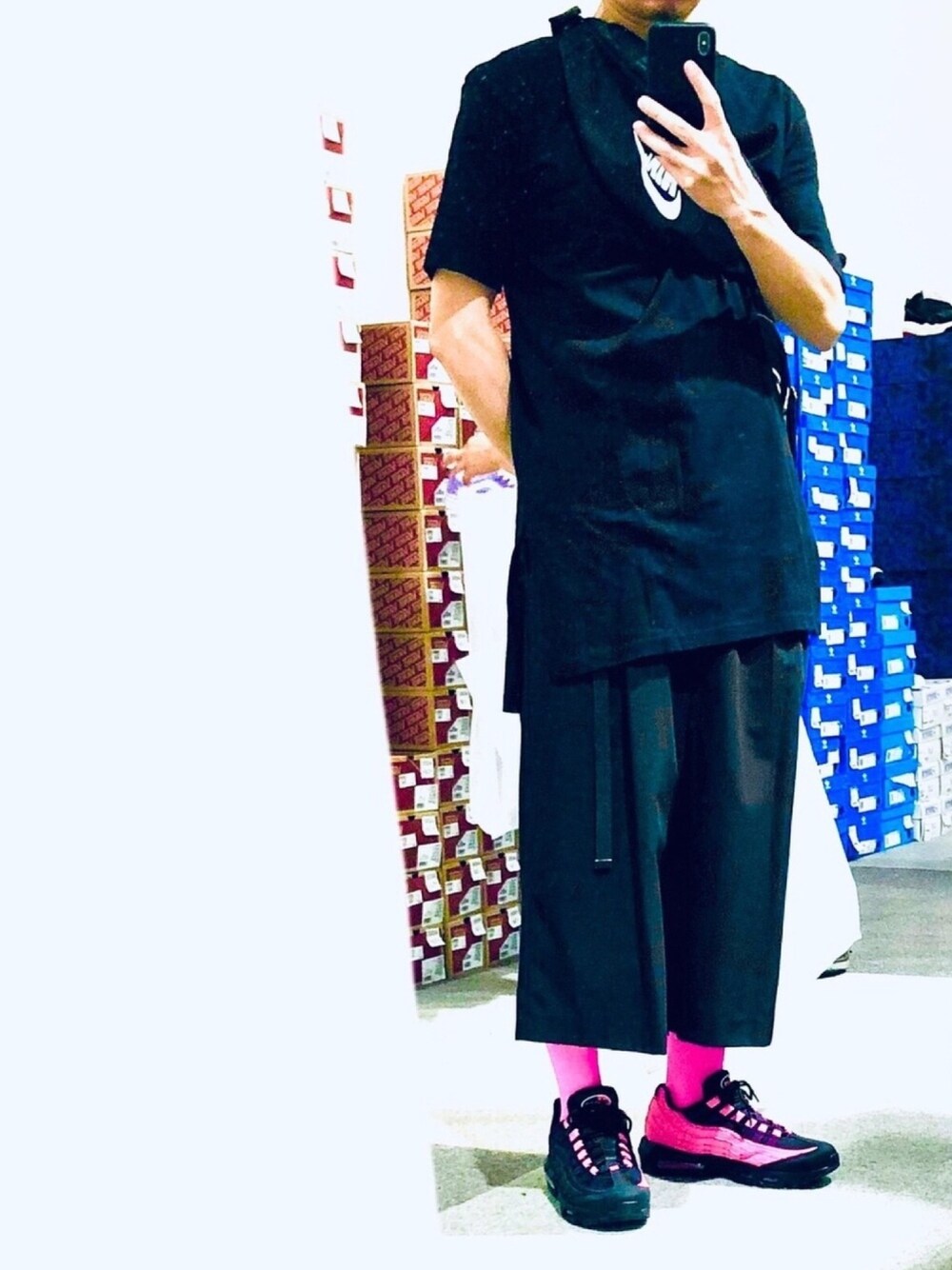ブラックコーデに足元だけピンク!