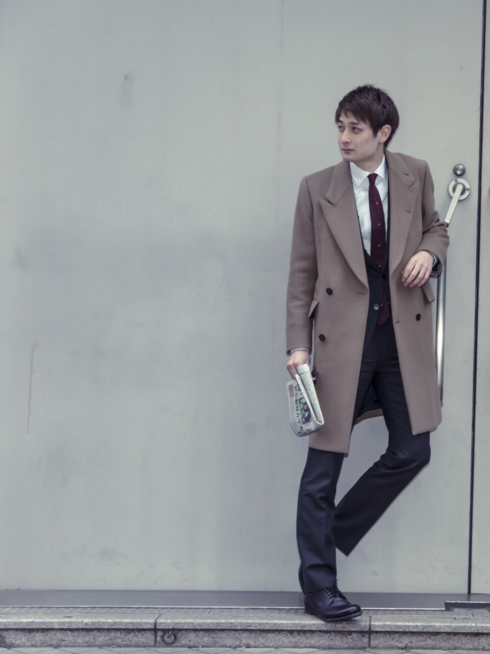 スーツはhugo boss, シャツ, コート, サングラス, ネクタイはpaul smithです。靴はPRADA 今回は一捻りしてクロースアップ(イメージ)写真を別に載っけます。 スーツで、色に統一感を出してみたかったです。僕は茶系が好きなので、赤、茶、ワインなどでコーデをして統一感を出しています。スーツ、実はチャコールグレーで、赤い縫い目も入っているのです。 ブログ、見てみてください。 ulyssesaoki.com