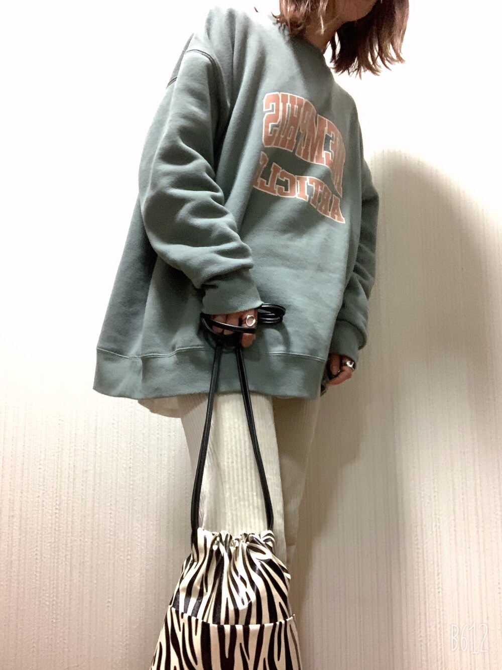 おまめ。のスウェット「裏起毛カレッジロゴビッグシルエットスウェットトレーナー」を使ったコーディネート