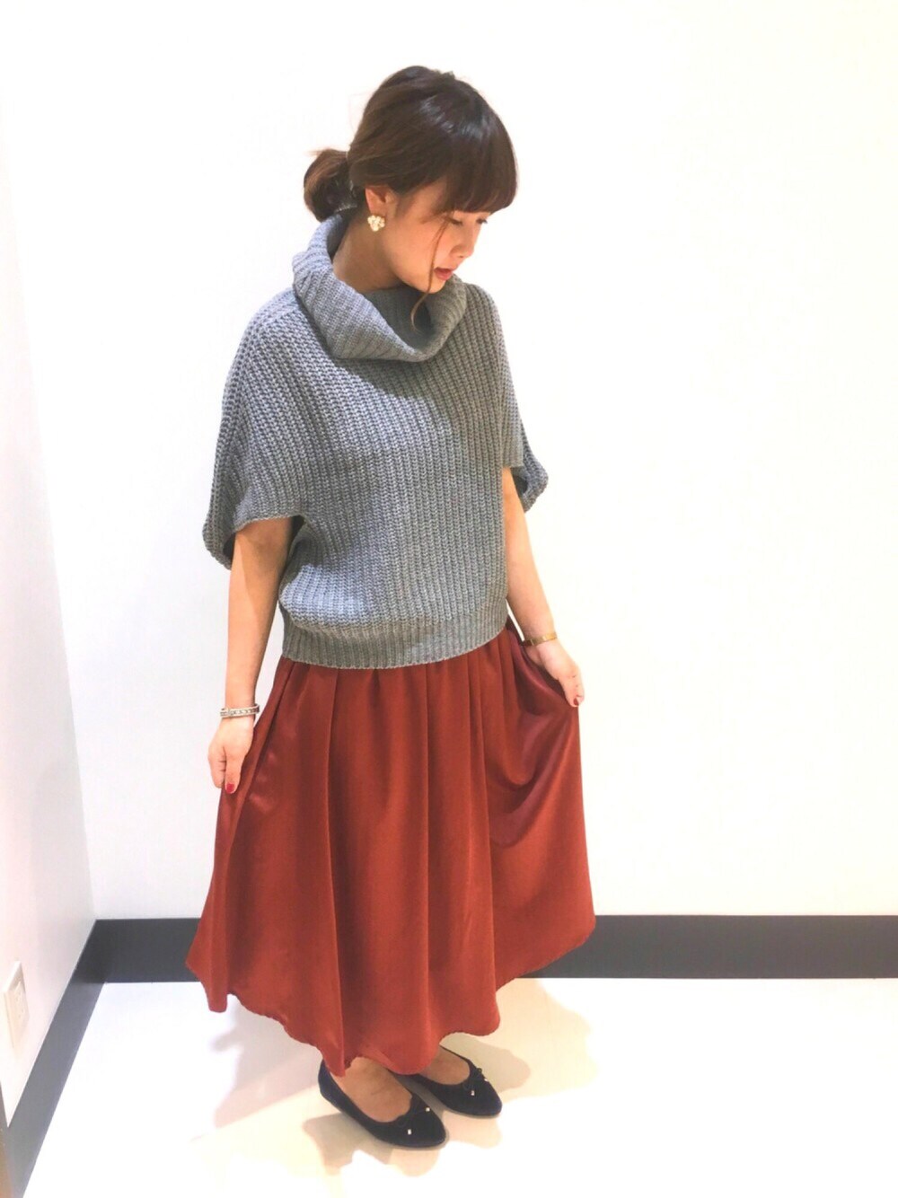 ざっくりタートルニット🍂 ポンチョのような形で、まだ気温が高い今は これくらいの袖の長さがちょうど良いですよね♪ ツヤ感のある、アシンメトリーのスカートでカジュアルになりすぎないよう合わせました💕 なんだか私、この色の組み合わせ多い気が...🤔💭