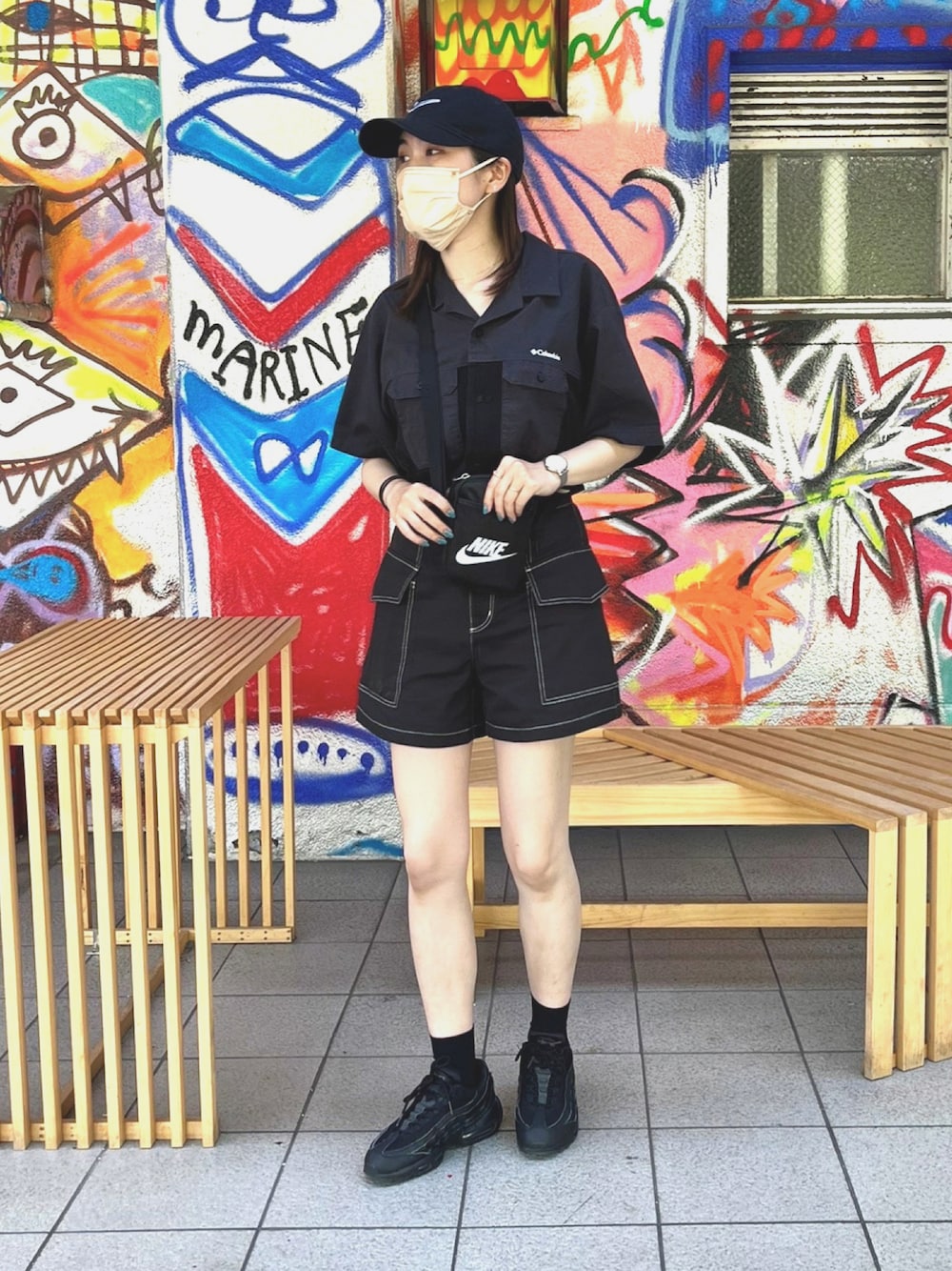 ボーイスカウトさんのような⛰☀️ オールブラックコーデです⬛️⬛️⬛️ GUのステッチショートパンツが とてつもなく可愛い🩳 ベージュとホワイトもあるのでどれも買おうかと🤤