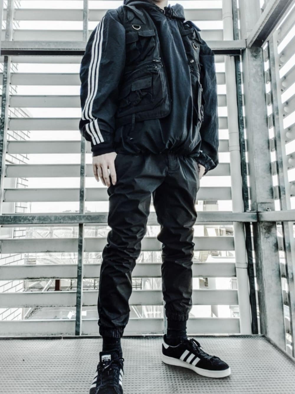 ウィンドブレーカー:adidas ミリタリーベスト:rothco ジョガーパンツ:UR スニーカー:adidas campus