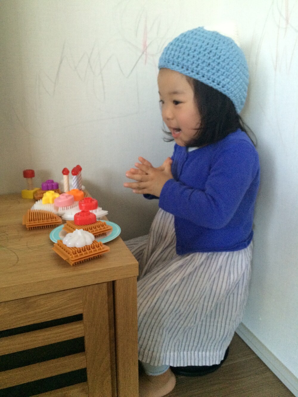 テレビ台の隅っこで 逆さにしたゴミ箱をイス代わりにして1人お誕生日会をする娘 改めて見ると落書きすごい(°_°)